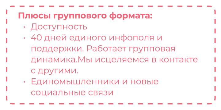 В формате консультации мы прорабатываем один вопрос. На группе вы исследуете вопрос глубоко с разных сторон, ищете ключик к решению с моей помощью и под моим руководством. Мы общаемся не 2 часа, а минимум 16 часов не считая поддержки и обратной связи в чате, где вы также получаете ответы на свои вопросы.